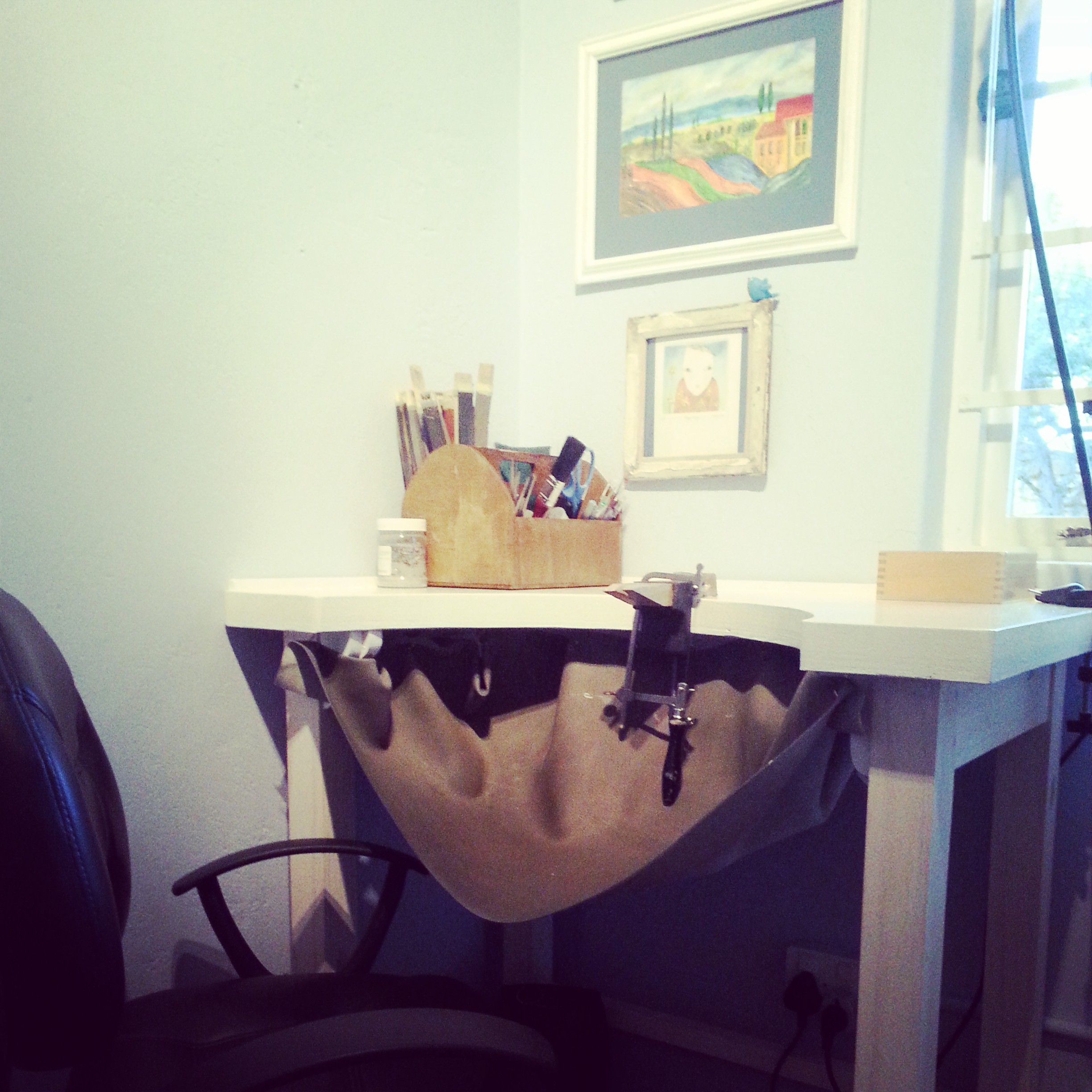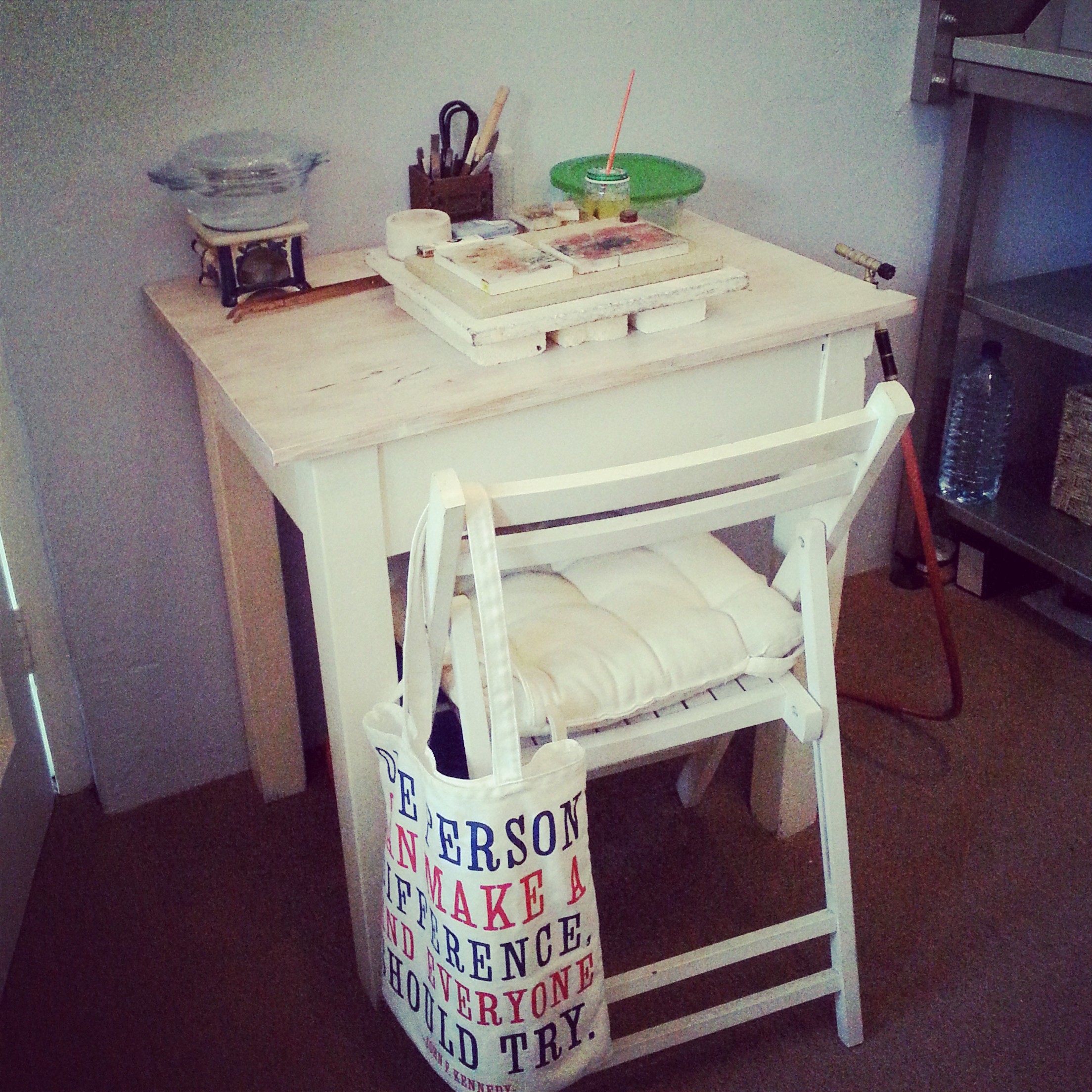 I had my bench custom made by a wonderful carpenter in Muizenberg…I designed it so that it would fit the space and be the perfect height for me to work comfortably.