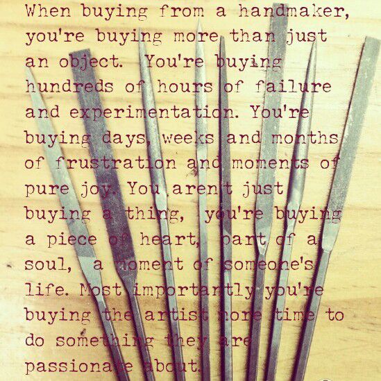 When selling hand-made work, it is always interesting to see how people react not only to the work itself but also to the price of the work.For the most part, people can see and appreciate the value of a hand-made piece of art or jewellery over one that has been commercially produced to make profit. However, there are always a few people who will ask “Why is hand-made work so expensive?”. For those who don’t really understand what time, emotion and effort goes into making a piece by hand…and for all of the people who do and who appreciate a one of a kind design…here is a beautifully worded quote that illustrates the value of time and investment that is inherent in work made by hand…