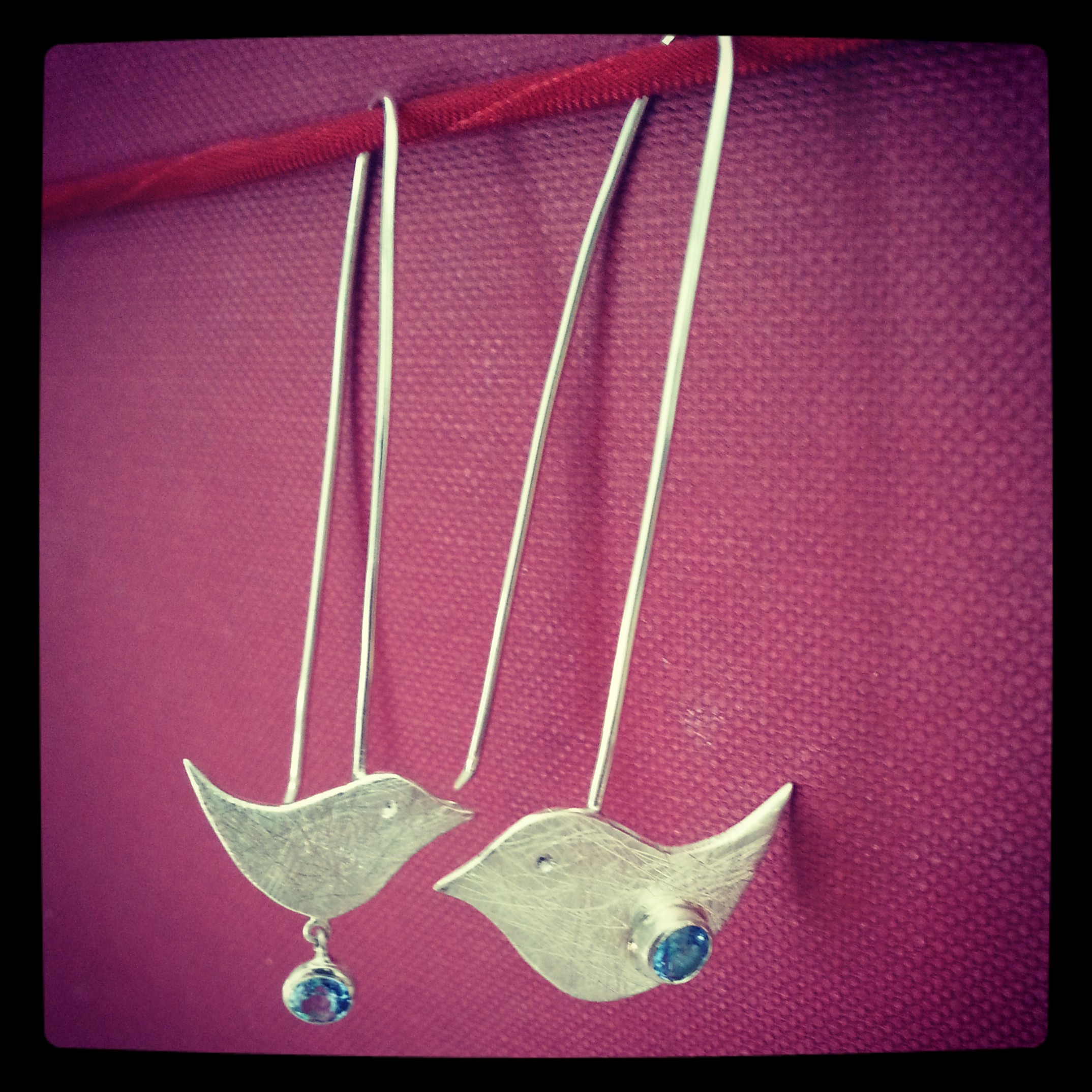 Last week I finished this pair of earrings…a commission for a talented print maker and artist. She wanted me to make bird earrings that did not match each other (my favourite kind of earrings) and she wanted stones that match the bright blue sea. I decided to keep the earrings quite simple so that they could be worn as a pair or one at a time. Here they are in sterling silver with faceted sky blue topaz stones…